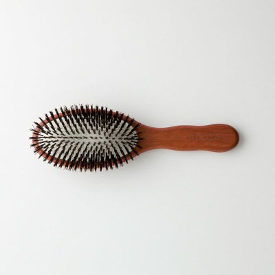 髪の量は多めなのですが、ブラシの毛の長さも適度で、頭皮がきちんとマッサージされます。ブラッシングすると髪に艶が出て、しっとり纏まります。デザインも素敵でクッションとウッドの色合わせがいいです。ブラシの重さも軽く、握りやすいです。大切に使います。
